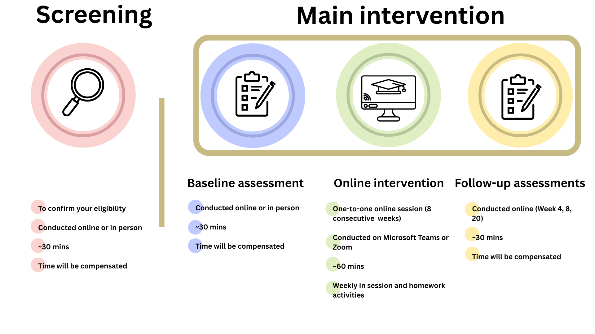The study involves two main procedures: 1) Screening (at the beginning); and 2) Main study (lasting 20 weeks)